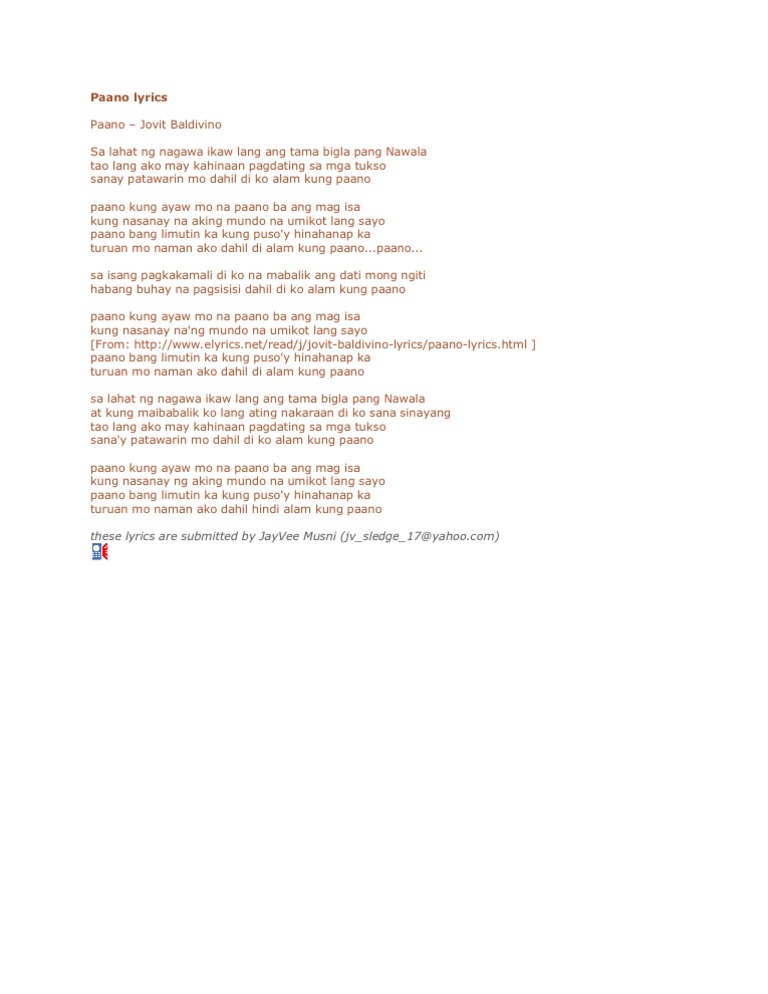 Paano by Jovit Baldivino Lyrics. Paano Mo Malalaman Kung May Crush Sayo ang Isang Tao. Paano - 1 Lyrics Sa lahat ng nagawa ikaw lang ang tama bigla pang Nawala Tao lang ako may kahinaan pagdating sa mga tukso Sanay patawarin mo dahil di ko alam kung paano Paano kung ayaw mo na paano ba ang mag isa Kung nasanay na aking mundo na umikot lang sayo Paano bang limutin ka kung pusoy hinahanap ka Turuan mo naman ako dahil di alam kung.