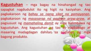Ano naman ang kagustuhan. Ito - pagkain inumin tahanan at pananamit hindi makatatagal ang tao. Ito ang mga bagay na maaaring wala ang isang tao subalit sa kabila nito ay maaari pa rin siyang.