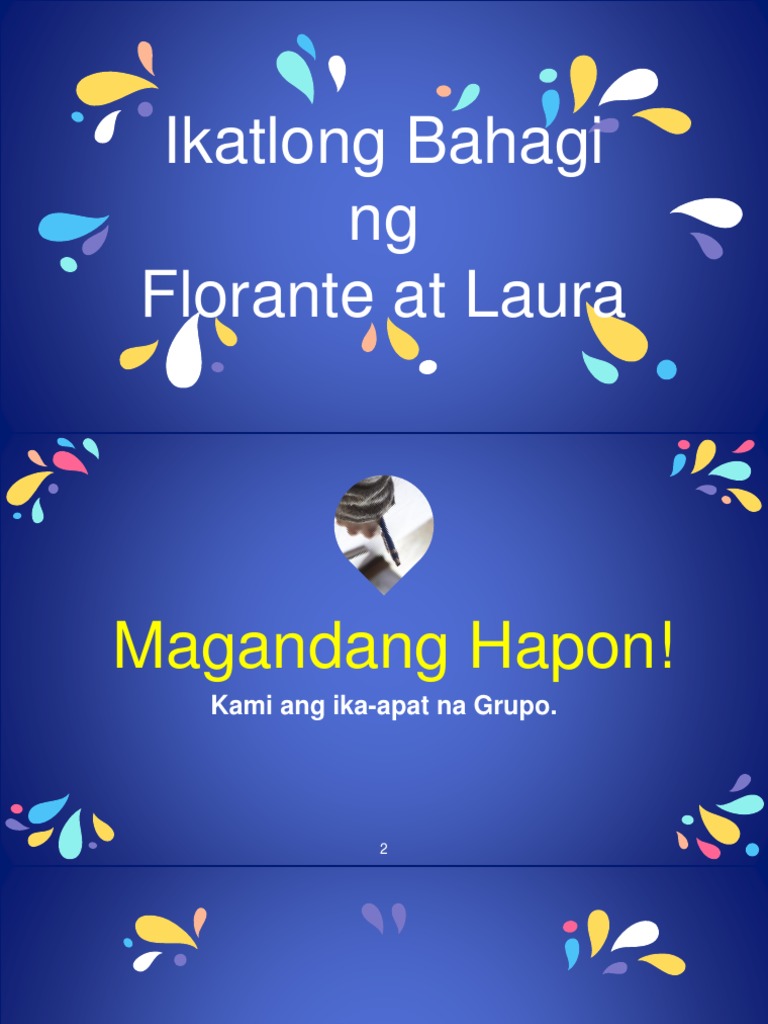 Alamat bugtong El Filibusterismo Epiko Florante at Laura Ibong Adarna Kwentong bayan Mabuting Asal Mga Bayani ng at nang Noli me tangere Pabula Paksa Pandiwa Pang-abay Pang-uri Pangatnig Panghalip Pangngalan Parabula. Ng Florante at Laura Magandang Hapon. Naisulat ang Florante at Laura noong panahon ng mga Espanyol.