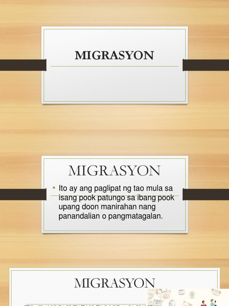 Migrasyon ito ay ang paglipat ng tao mula sa isang pook patungo sa ibang pook upang doon manirahan nang panadalian o pangmatagalan tumutukoy sa proseso ng pag- alis o paglipat mula sa isang lugar o teritoryong politikal. Maituturing na mabuting epekto ng migrasyon ang pagkakaroon ng sapat na suweldo ng mga manggagawa upang matustusan ang pamilya. Araling Panlipunan 28102019 1729 christiandumanon.